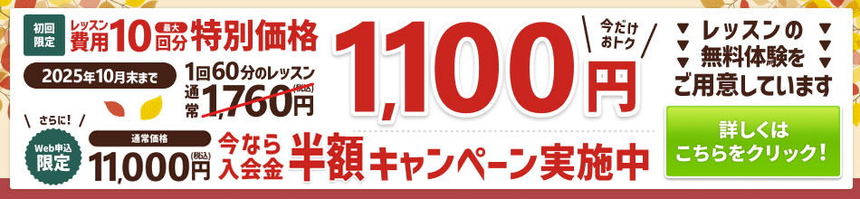 さらに、最大10回分のレッスン費用を1レッスン1,100円(通常1,760円)の