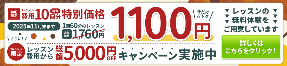 さらに、最大10回分のレッスン費用を1レッスン1,100円(通常1,760円)の